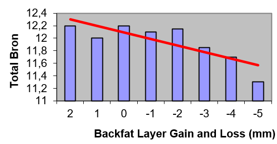 Este proyecto de investigación se llevó a cabo durante un período de 5 años en nuestra unidad de 1700 cerdas (2200 cerdas en 2020), donde registramos un rendimiento de más de 15,000 partos. Se recogió el peso corporal y la grasa dorsal de cada cerda antes y después de su período de lactancia. Estos datos nos permitieron ver los efectos de la lactancia materna dentro de una granja comercial. A continuación se muestra un resumen de los resultados, que sugiere que cada milímetro adicional de pérdida de grasa dorsal después de 2 mm reduce el tamaño de la camada posterior en al menos 0,2 lechones.