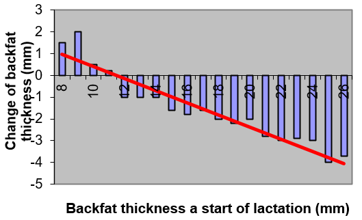 Grosor de la grasa dorsal al principio de la lactancia vs contra cambio en el grosor de la grasa dorsal
